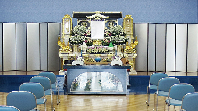 お式場に飾り付けを行ないます。僧侶の控え室や、接待の茶菓子などをご用意します。